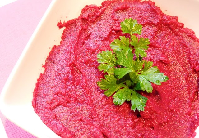 Il vous faut 1 boîte de pois chiches, 1 petite betterave cuite, 2 càc cumin et une petite gousse d’ail . Mixer-le tout et mettre au frais.