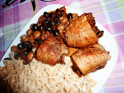 3 - Dans une cocotte faites dorer à feu vif les roulés de porc et les retournant souvent . Ajouter l’ail, les champignons , les olives et du thym. Verser le vin et 10cl d’eau puis couvrir et faire cuire à feu doux pendant 15 min.