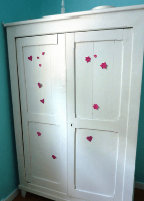 Je continue de vous présenter la  déco de la chambre de Miss Capucine. Au grand dam de ma grande soeur à moi, j’ai récupéré SON armoire de quand elle était petite fille. Du bleu et rouge, on est passé  à la couleur blanche. Alice a voulu absolument mettre un dessin d’elle dans la chambre de sa petite soeur. Alors avec son accord on l’a découpé en étoile et en coeur. Et elle toute seule, les a disposé sur l’armoire. Ca donne une jolie touche girly à la chambre et Alice est très très fiere.