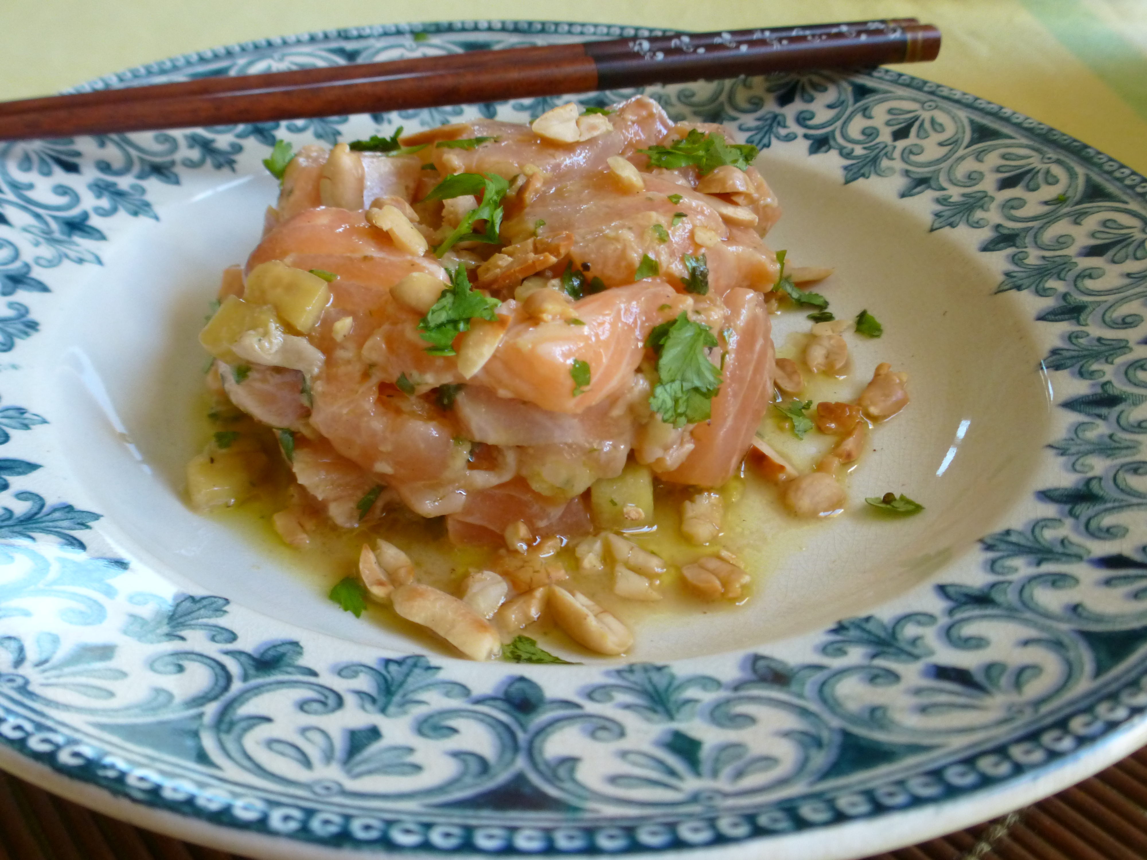 600g de saumon extra frais - 6 càs d’une bonne huile d’olive - 2 càs de vinaigre de riz - 2 càs de sauce soja - 1 citron vert - quelques gouttes de nam plat (ou sauce poisson) - 1 morceau de gingembre (de la taille du pouce) - 1 tige de citronnelle - 1 petit concombre - de la coriandre fraîche - sel & poivre - une poignée de cacahuètes grillées non salées