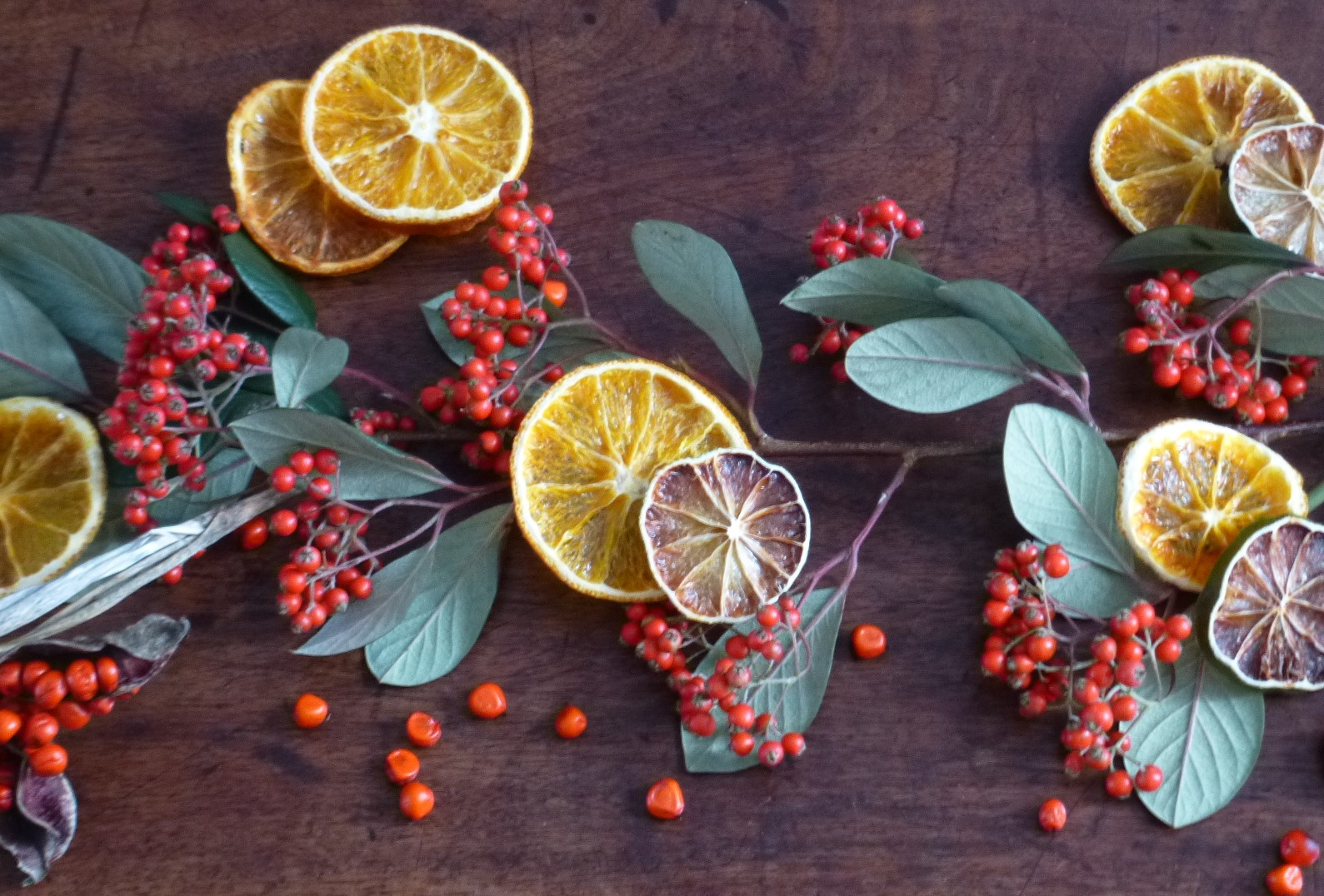 Du coup, ce week-end, j’ai ramassé des branchages à faire sécher et de jolies baies, le tout provenant de chez la voisine ou les copines! J’ai également fait des oranges séchées et je trouve que ça donne un petit coup de peps très sympa à ce centre de table nature. Et pour ne rien gâcher, ça embaume la maison d’un doux parfum.